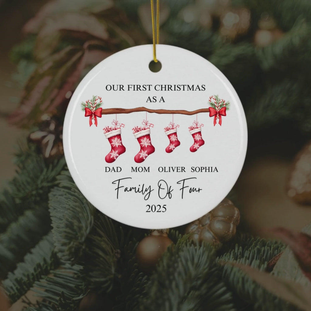 Capture the magic of your family's first Christmas together with this beautifully designed round ceramic ornament. Perfect for adding a personal touch to your holiday decorations, this piece is both stylish and sentimental.