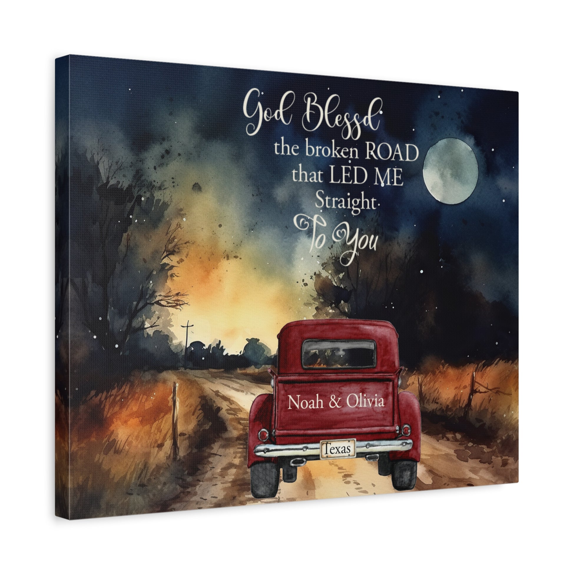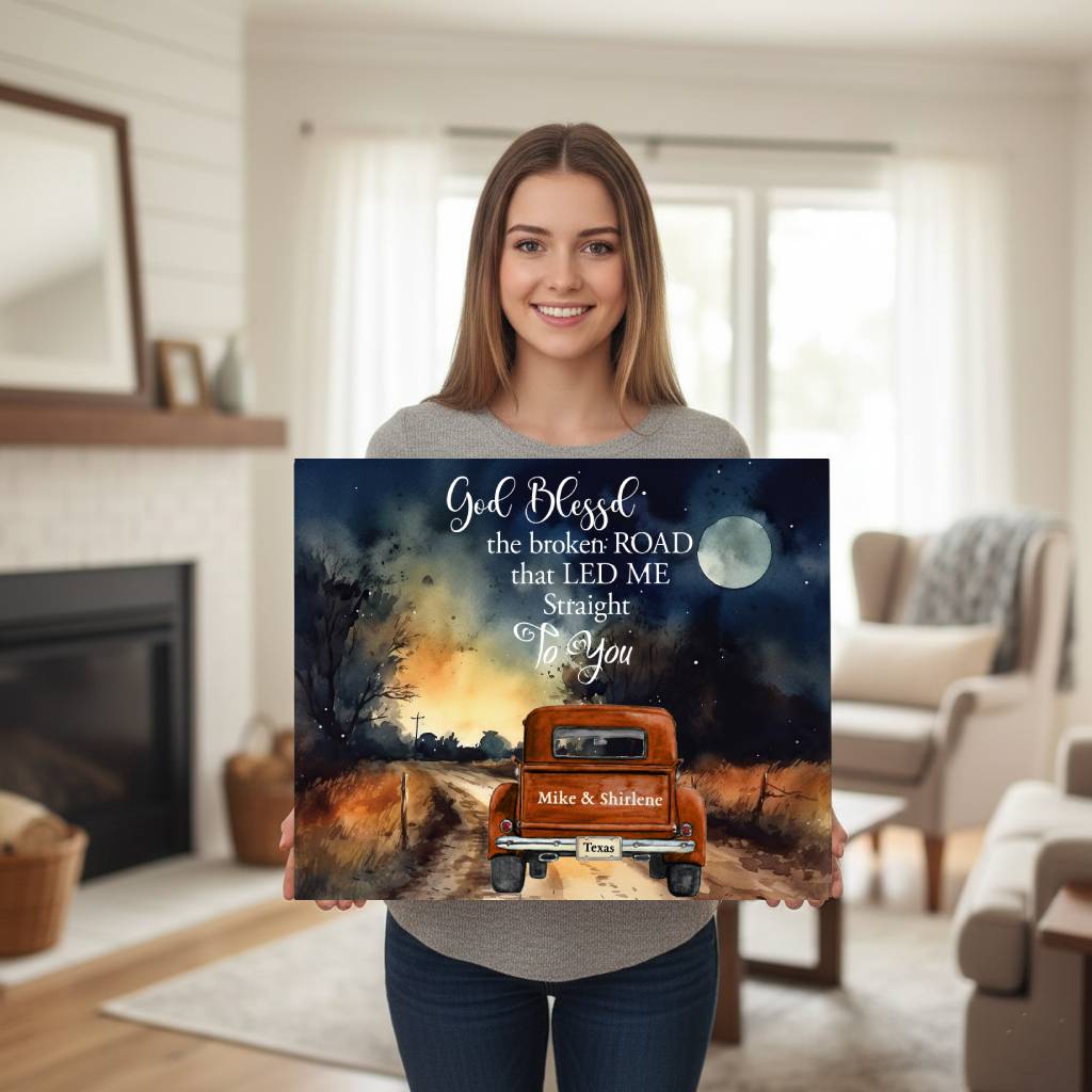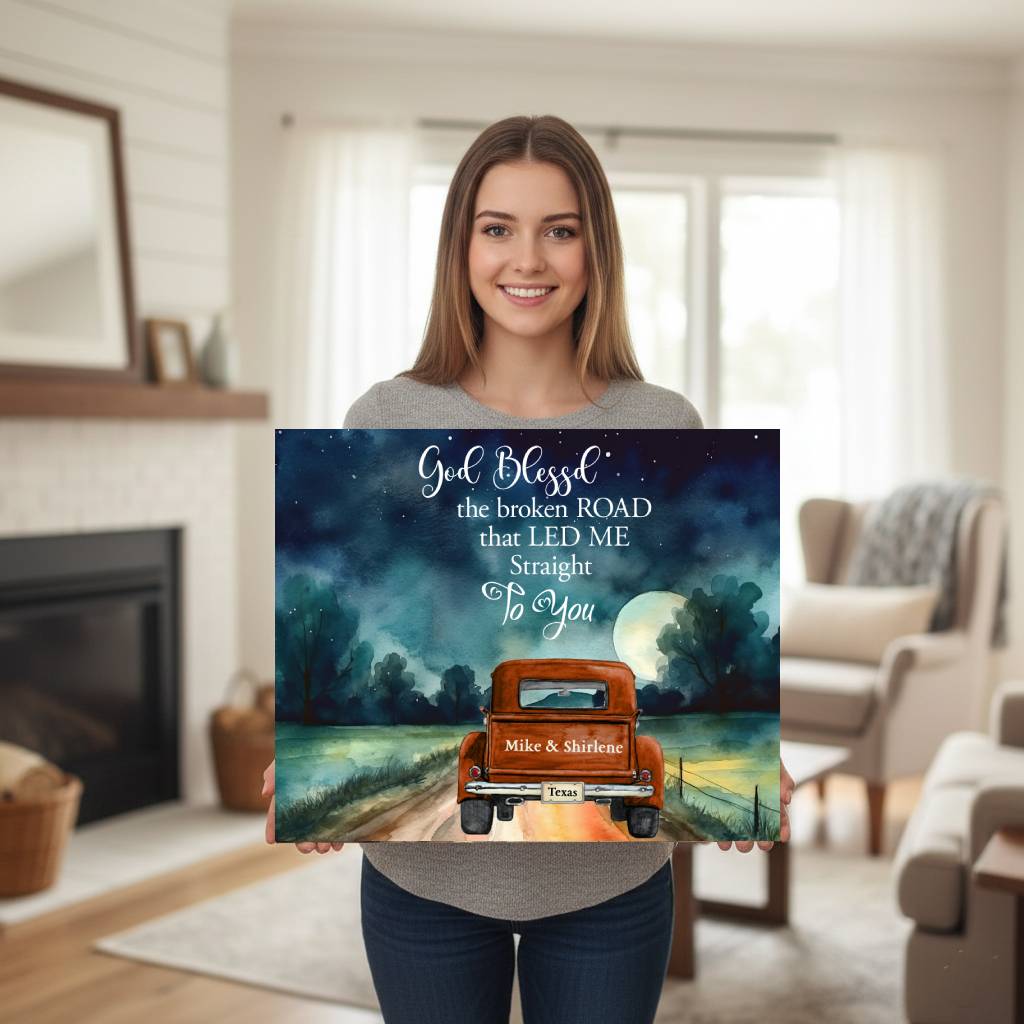 ✨ Transform your living space with this stunning canvas art showcasing a captivating landscape. Featuring a vintage red truck driving down a country road under a mystical night sky, the scene evokes romance and adventure. Perfect for couples, it's personalized with your names, making it a unique piece for any home.