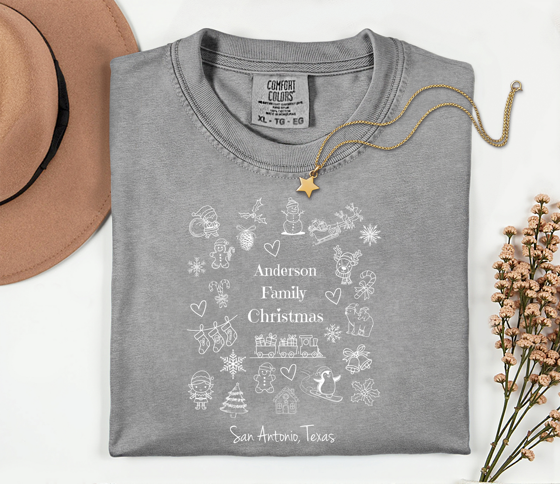 Celebrate the holiday season in style with our Custom Family Christmas T-Shirt, crafted from 100% ring-spun cotton for ultimate comfort. This soft-washed, garment-dyed tee features a relaxed fit, perfect for cozy family gatherings and casual wear. The unique design includes delightful Christmas-themed illustrations such as snowmen, hearts, gingerbread figures, stockings, trains, and more, beautifully arranged in a rich red color that stands out against the cream backdrop.