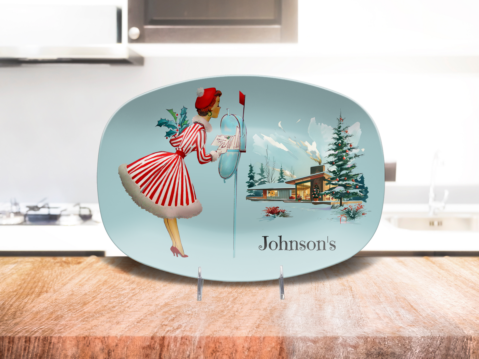 Bring nostalgic charm to your holiday gatherings with our Vintage Christmas Holiday Serving Platter. This beautifully crafted 10" x 14" oval platter features a festive scene with a retro-inspired design. The artwork showcases a woman in a classic red and white striped dress with a fur trim, holding holiday mail near a picturesque mid-century modern house, surrounded by snow-capped trees and a sparkling star in the sky. Personalized with the name "Johnson's," this design adds a personalized touch to your festive table setting.