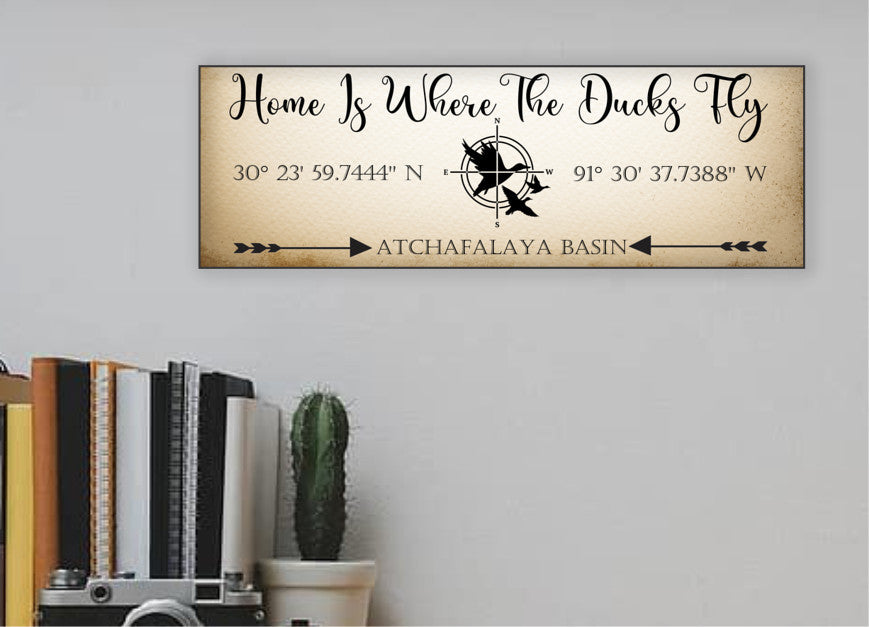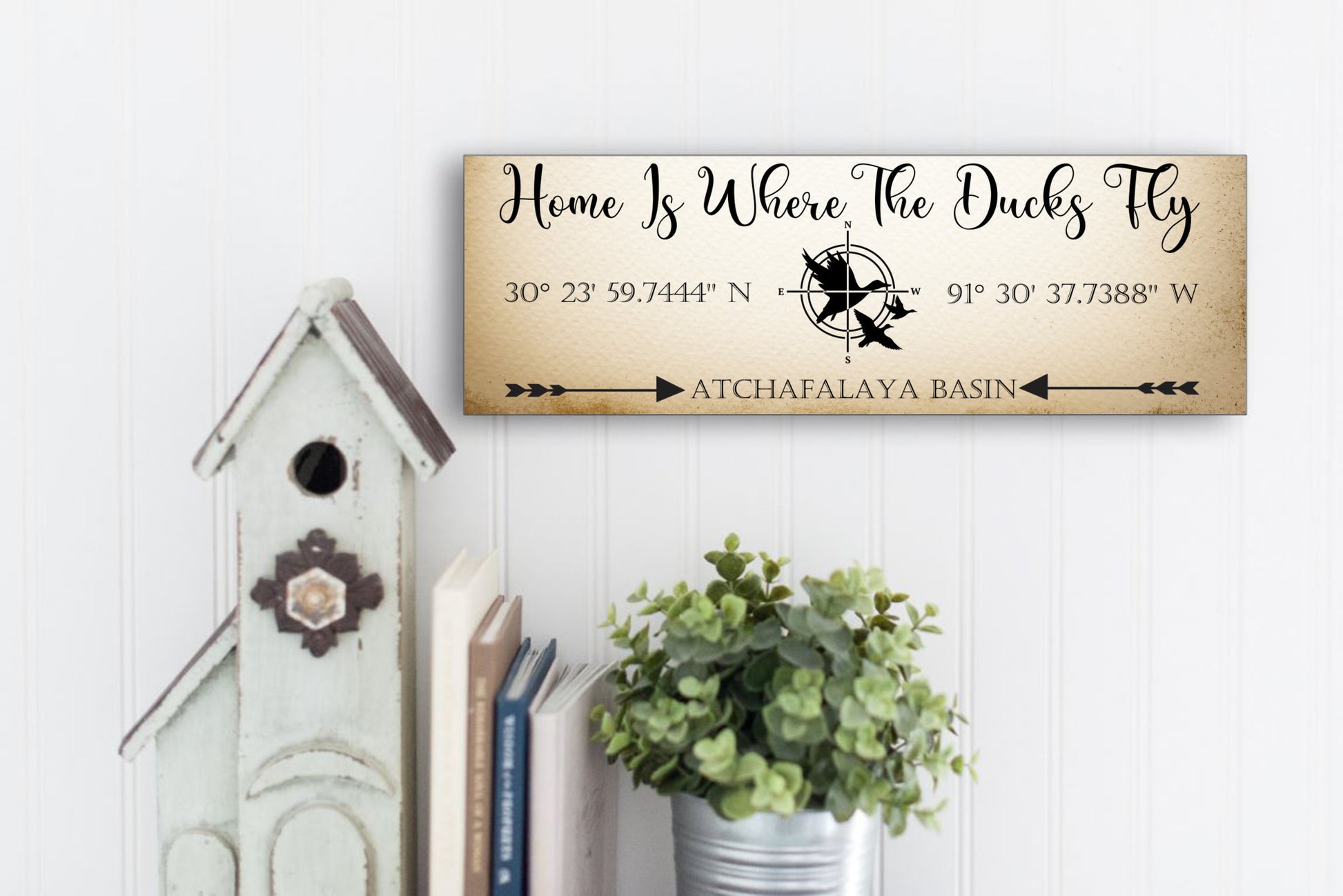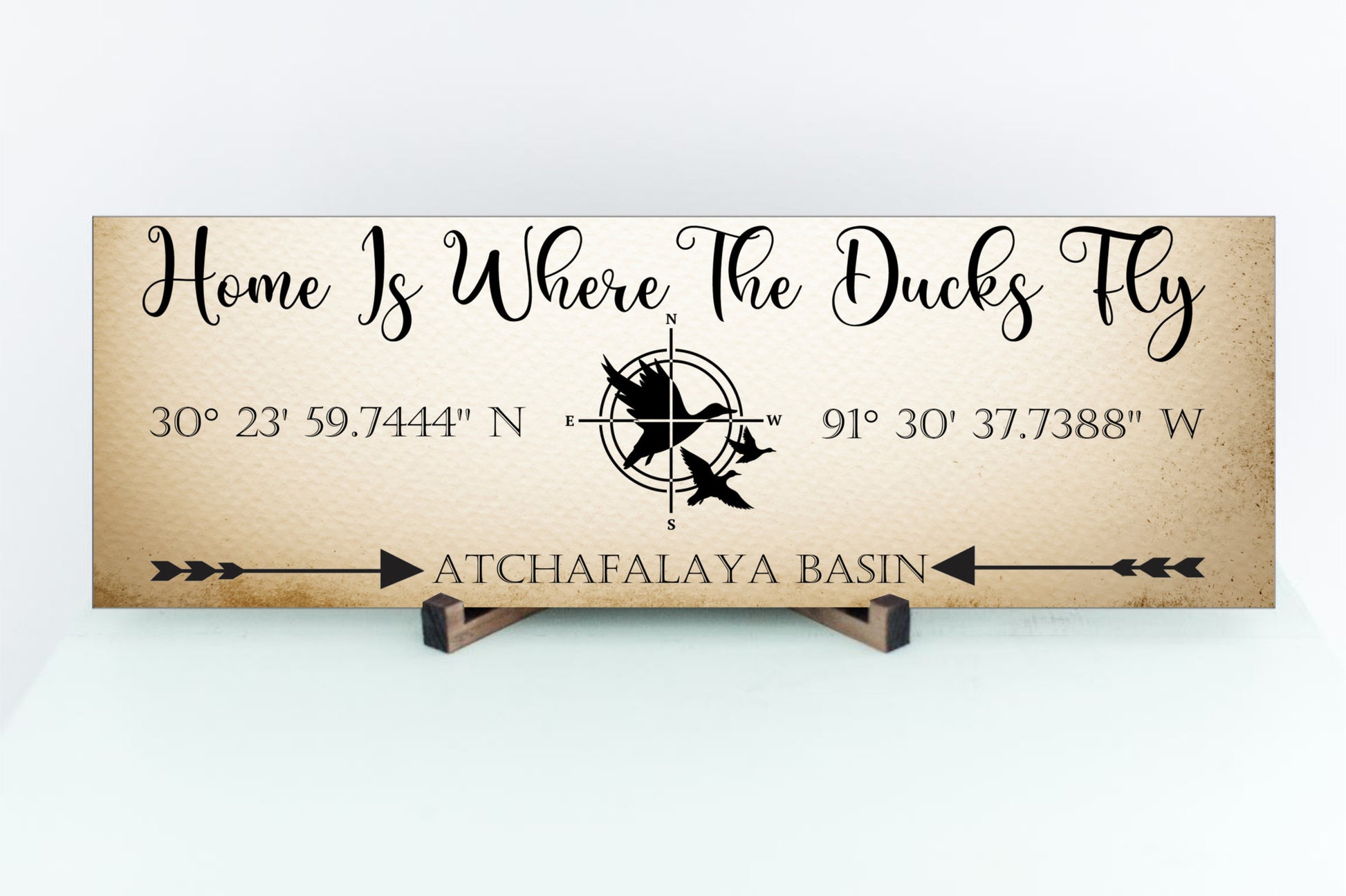 Looking for the perfect gift for the duck hunter or outdoor enthusiast in your life? Our custom-designed duck hunter sign is made in the USA and tailored to fit your needs. Personalize it with the name of your town or city, GPS coordinates, and a stunning design of flying ducks with directional elements (North, South, East, West) on a rustic color background.