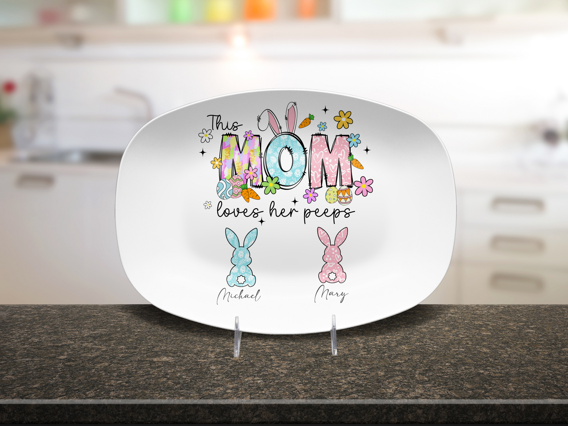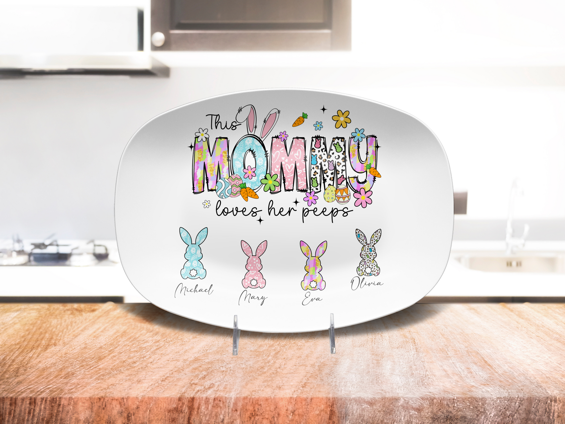 Celebrate Easter in style with this personalized Easter platter, perfect for moms, grandmas, and aunts who cherish their little peeps! Crafted from high-performance medical-grade polymer, this unbreakable 10" x 14" oval plate is microwave, dishwasher, and oven-safe (up to 250°F for 1 hour).