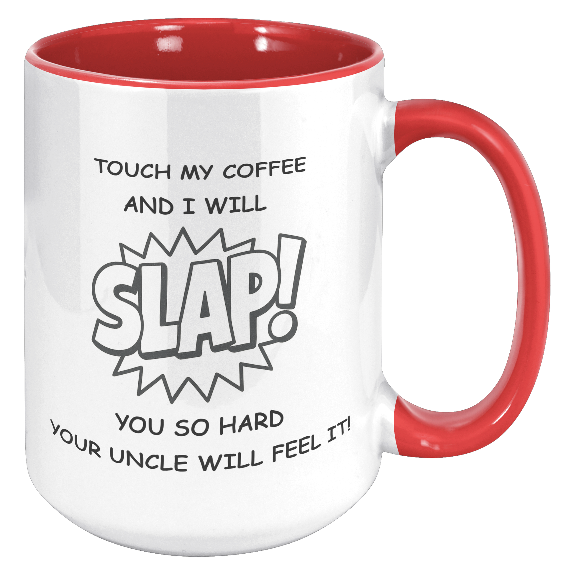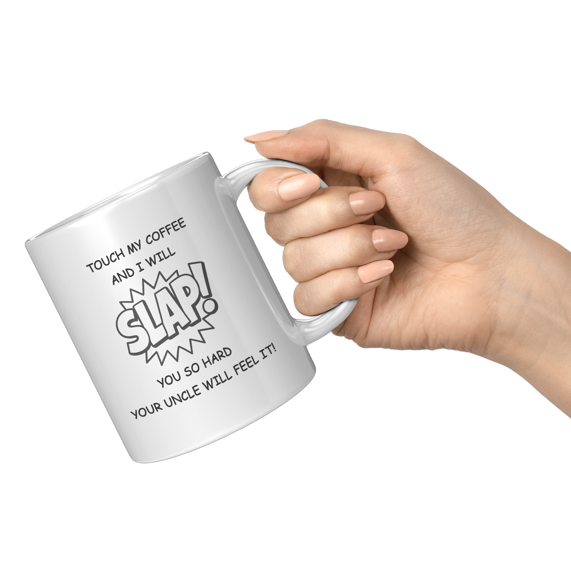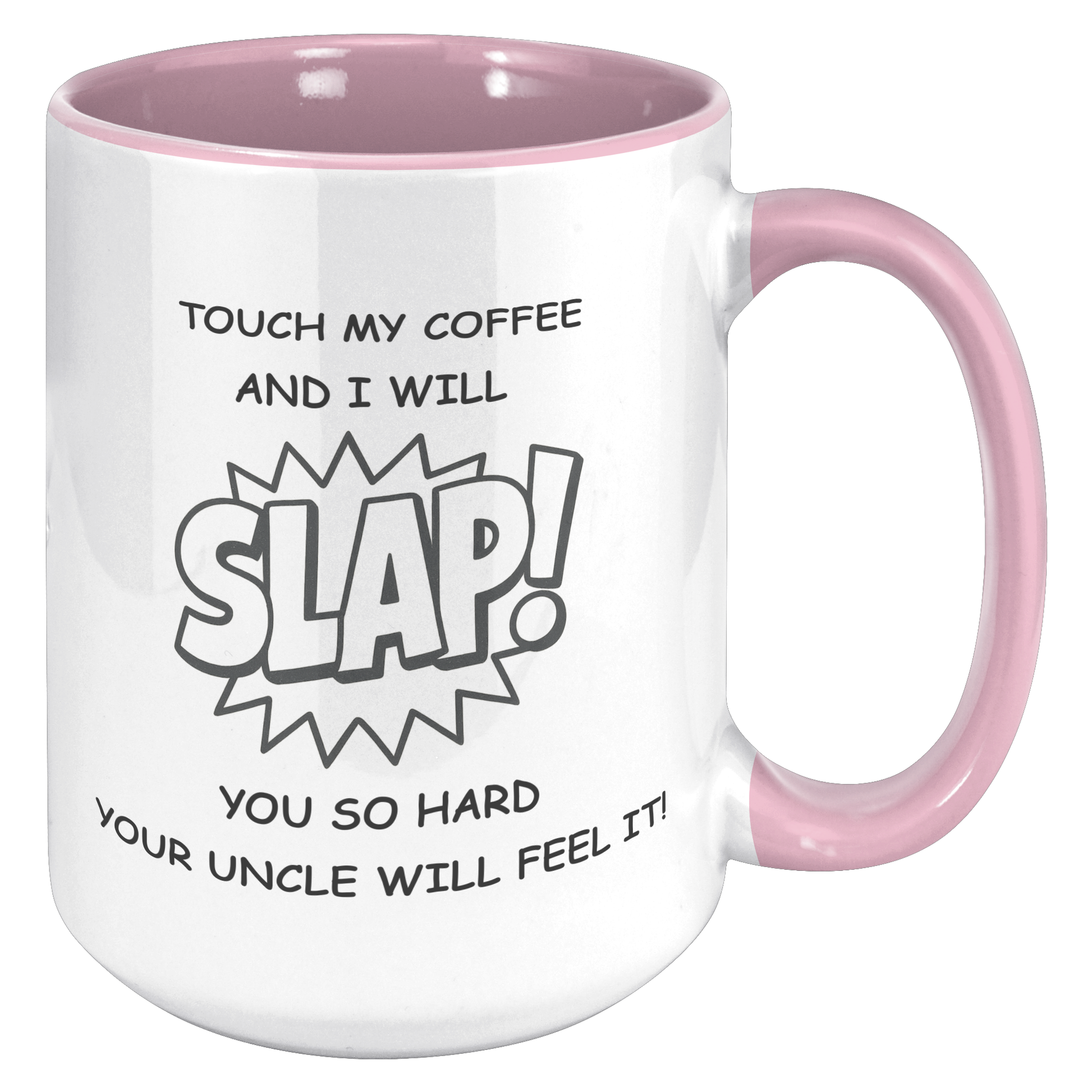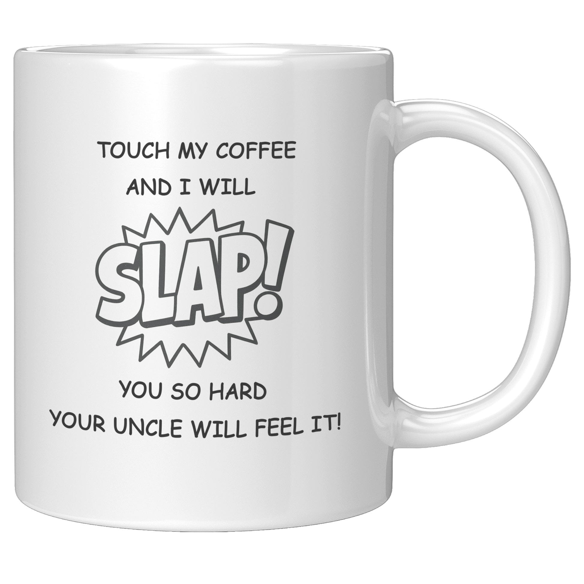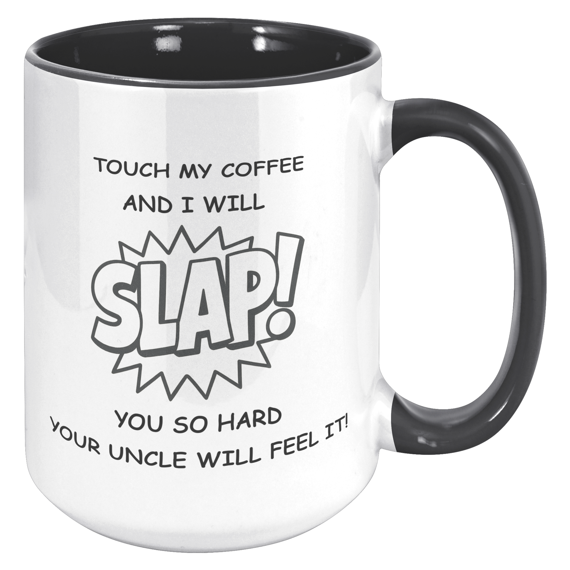 The back will have the funny phrase " Touch my coffee and I'll slap you so hard your uncle will feel it" Just to keep the Trump haters away. This make a great conversation and keep everyone laughing.