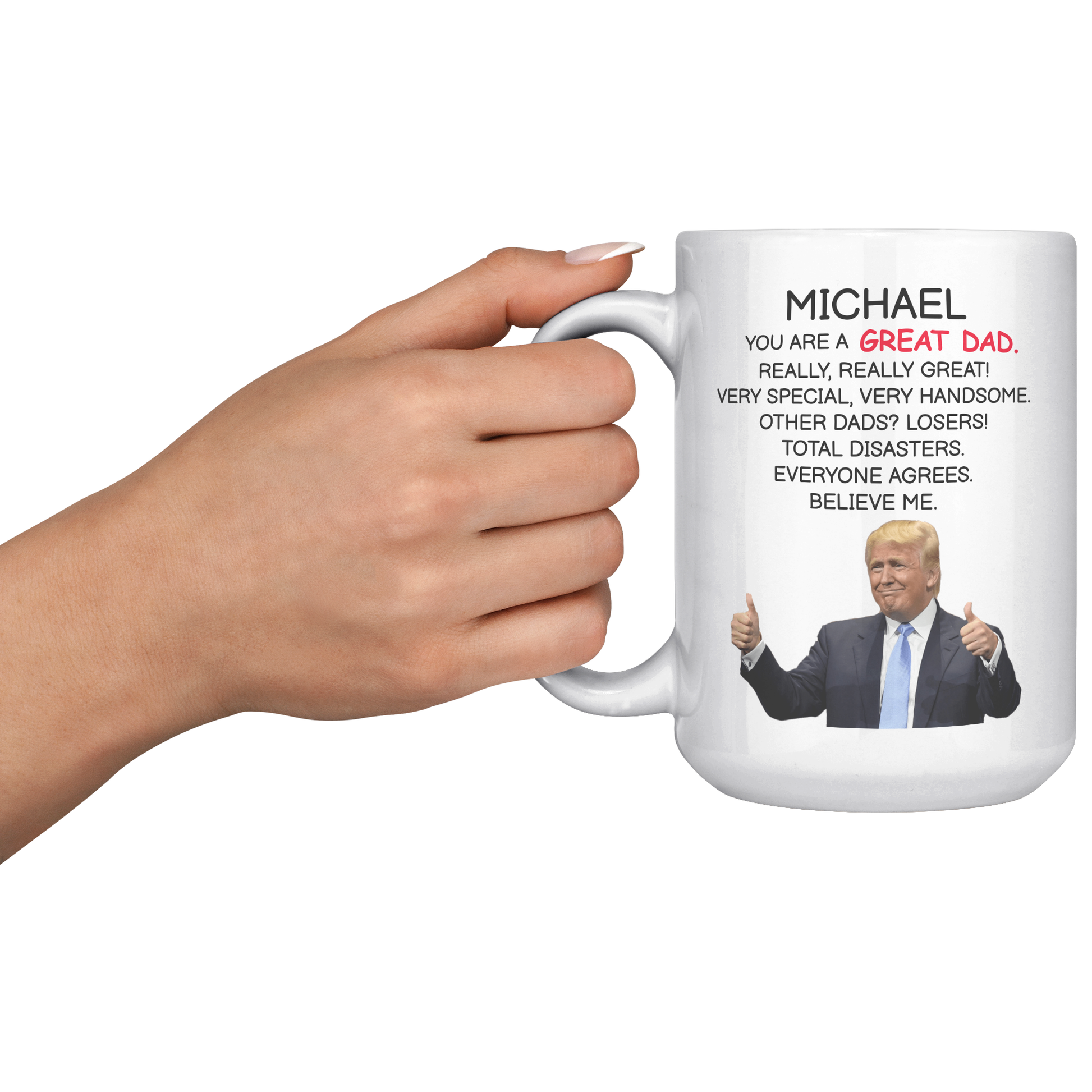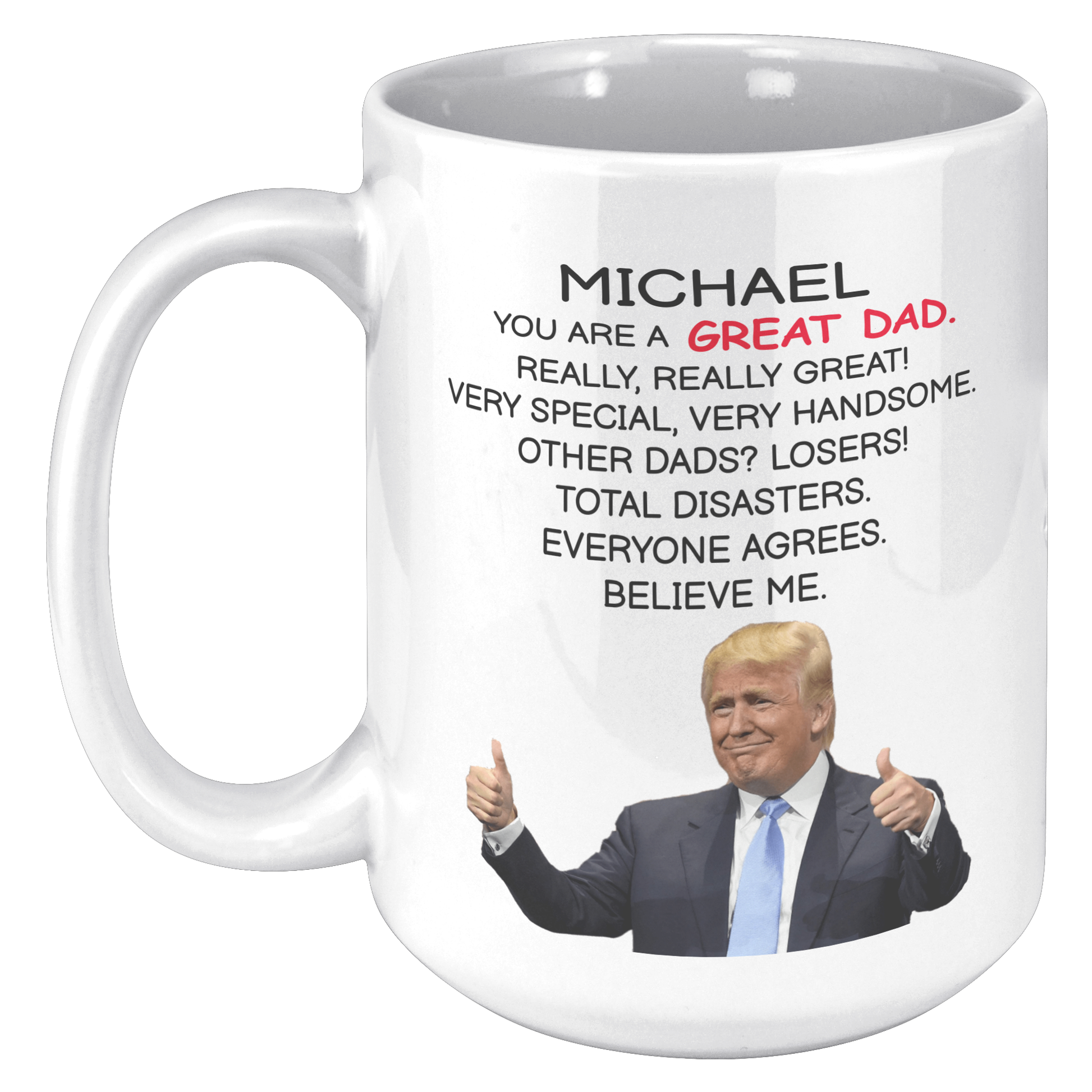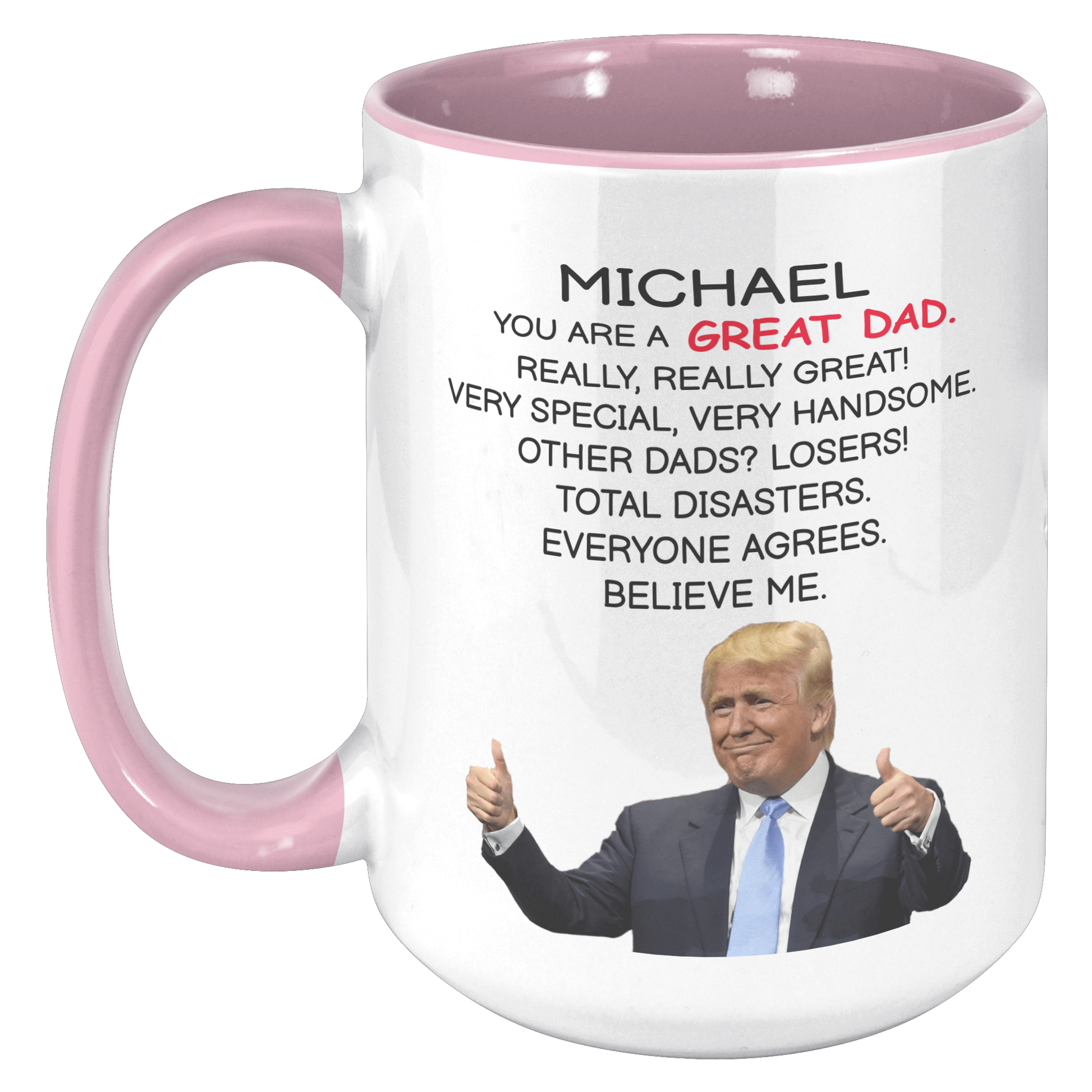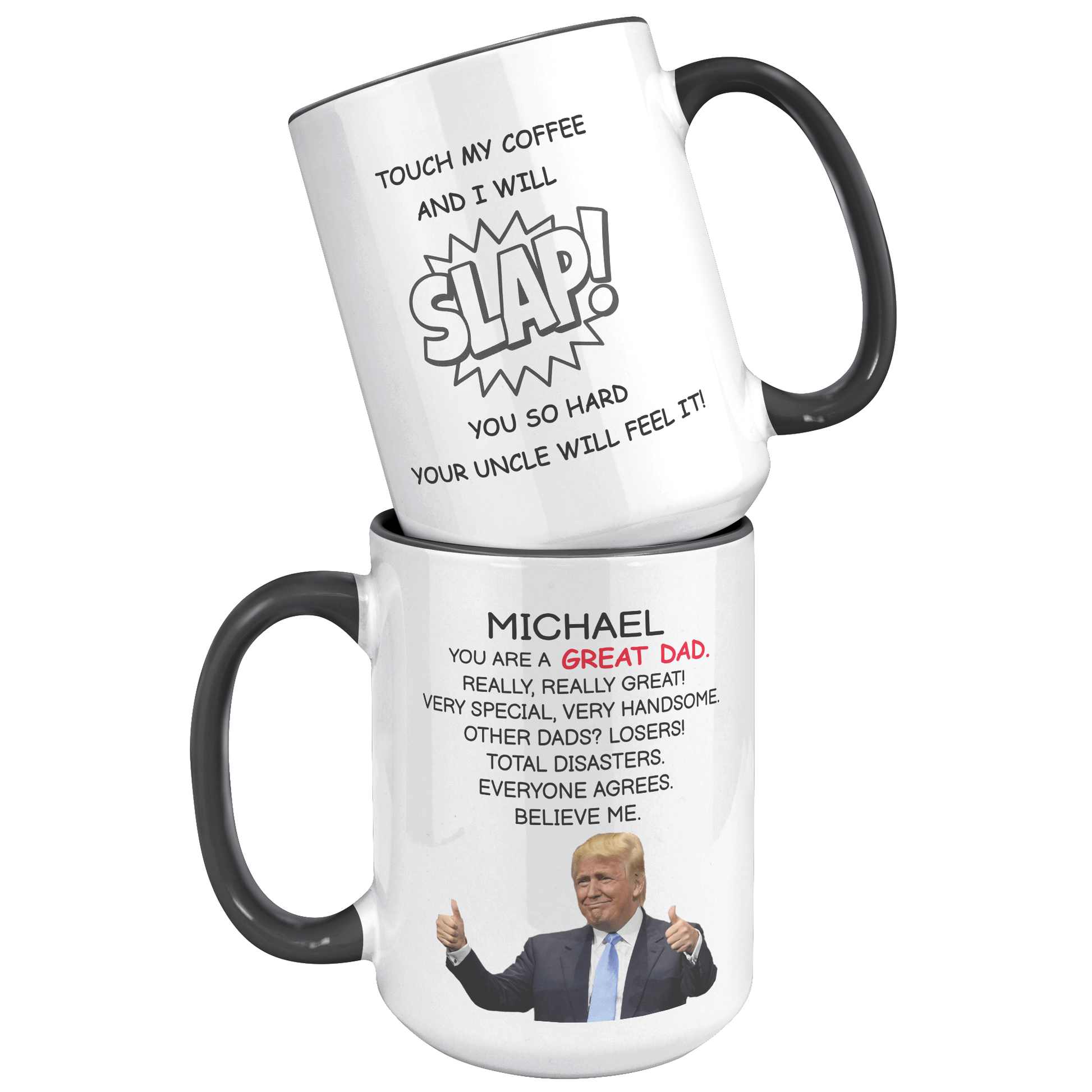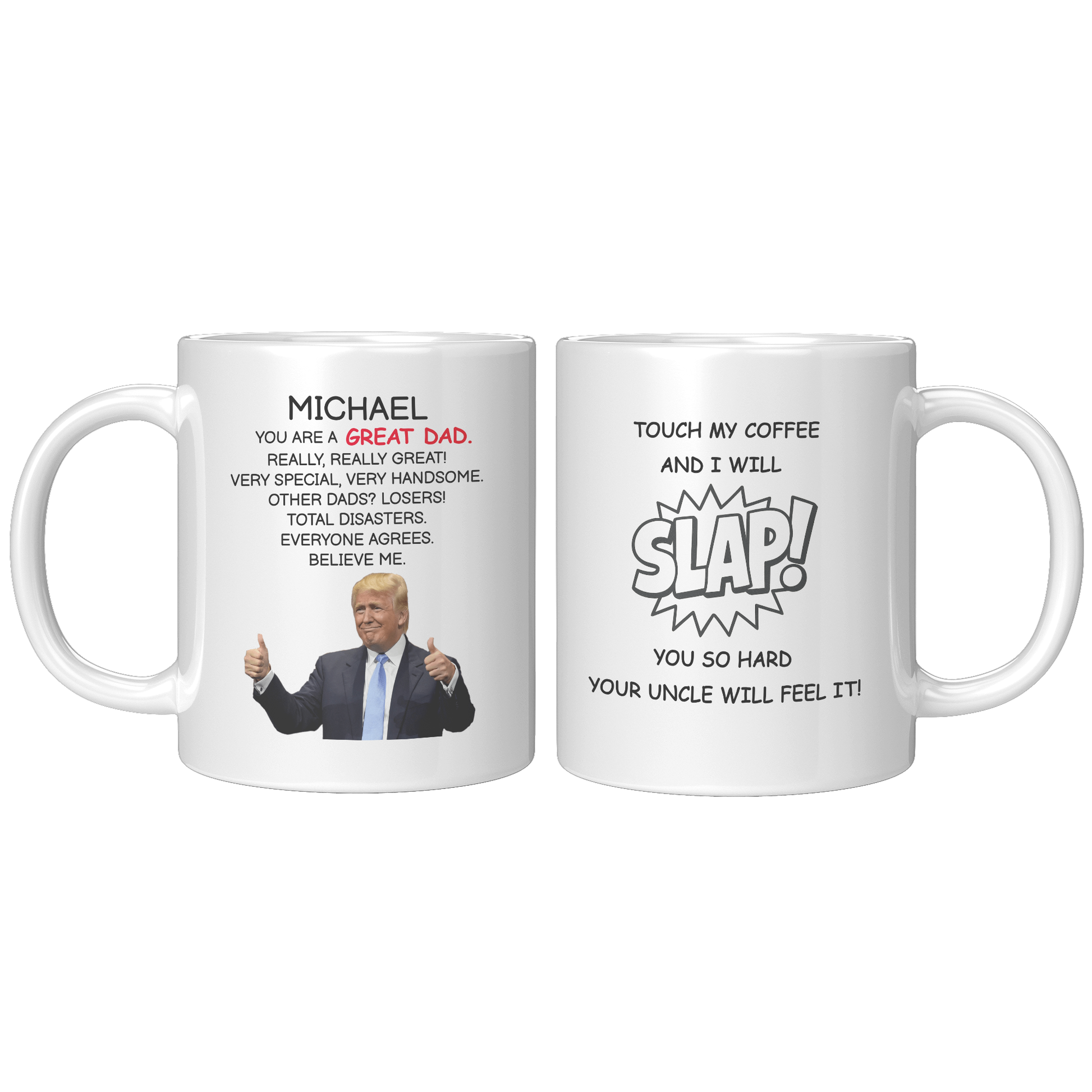 The mug is printed on 2 sides with each a different design. The front will have a picture of Trump with 2 thumbs up telling what a great Dad, Mom, Grandpa, Grandma, or any other nickname you chose even just a personal name like Michael.