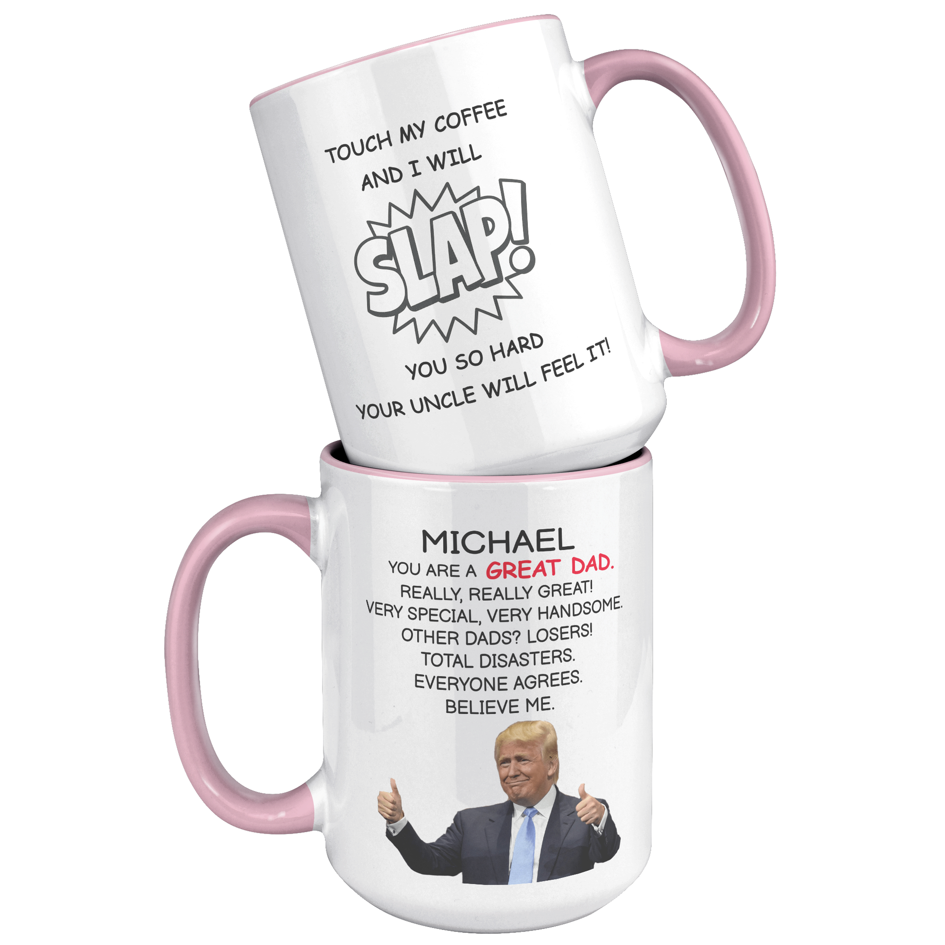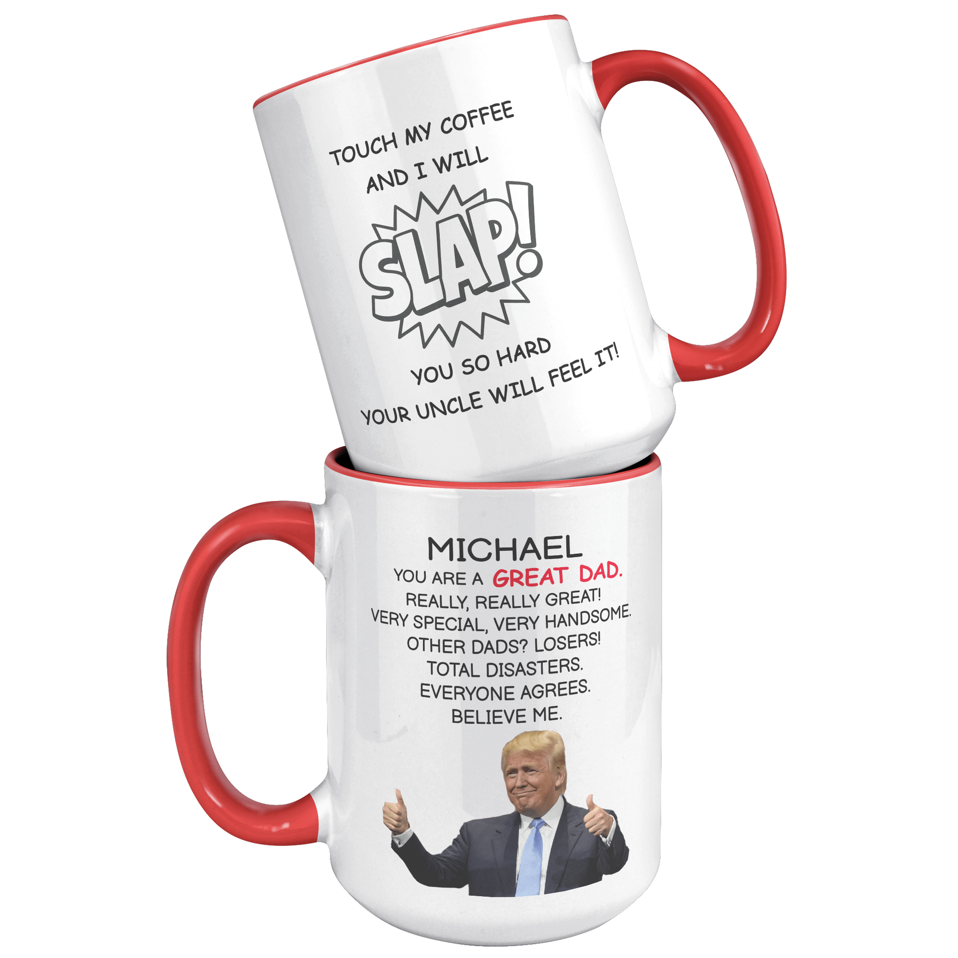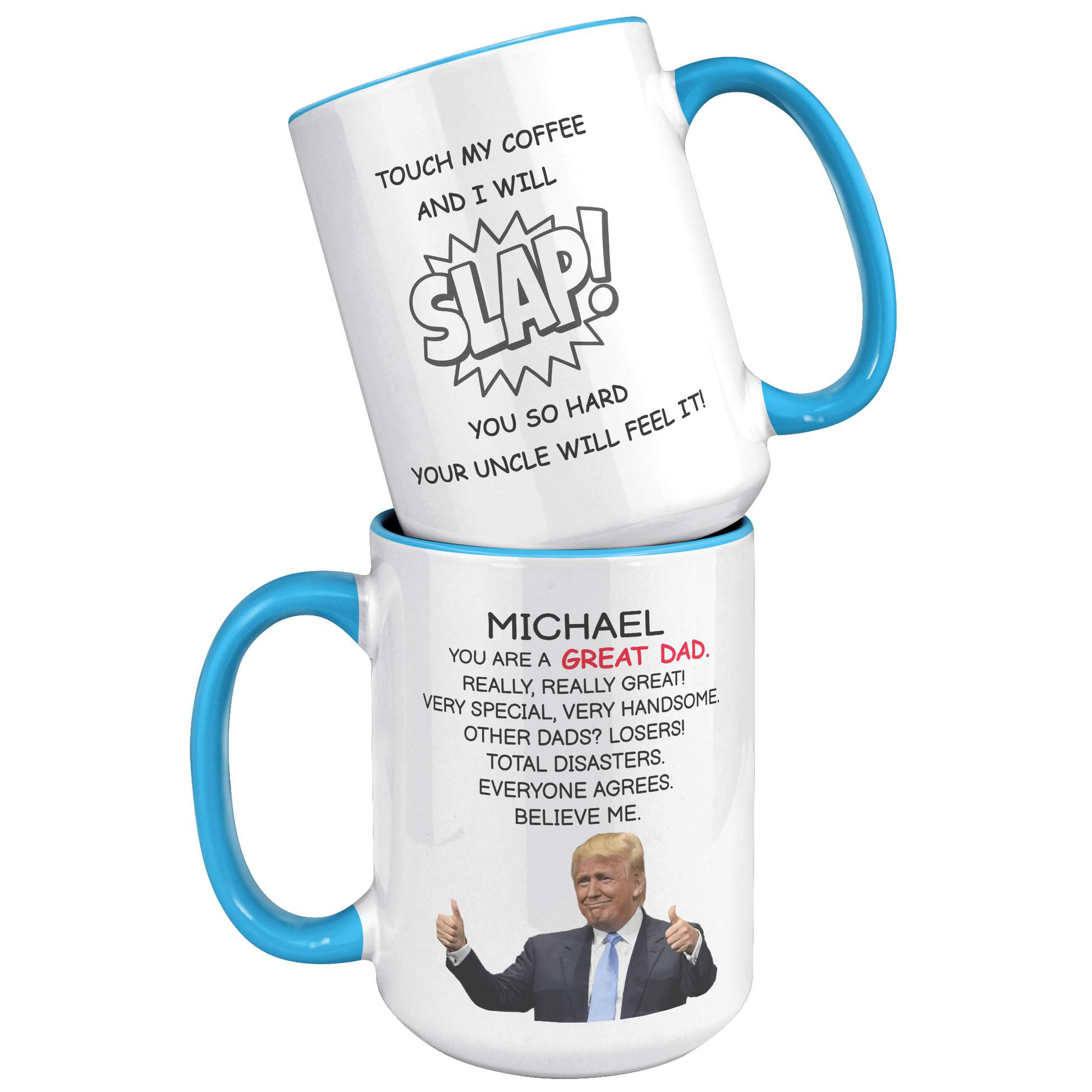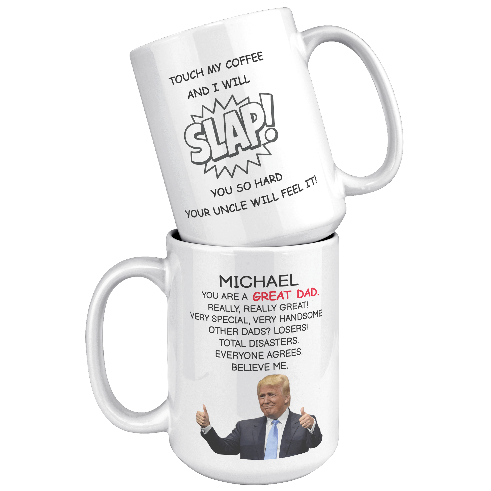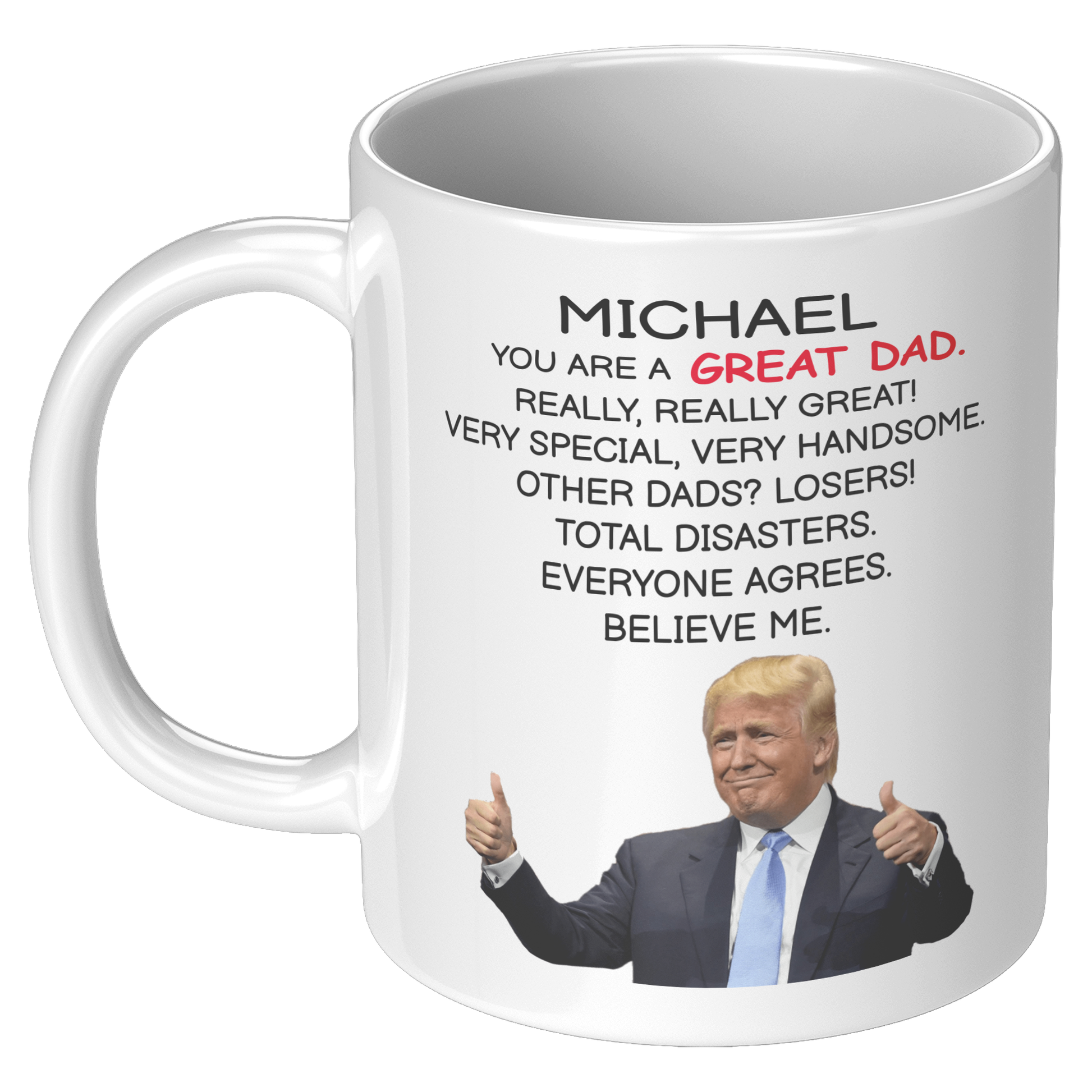 The mug is printed on 2 sides with each a different design. The front will have a picture of Trump with 2 thumbs up telling what a great Dad, Mom, Grandpa, Grandma, or any other nickname you chose even just a personal name like Michael.