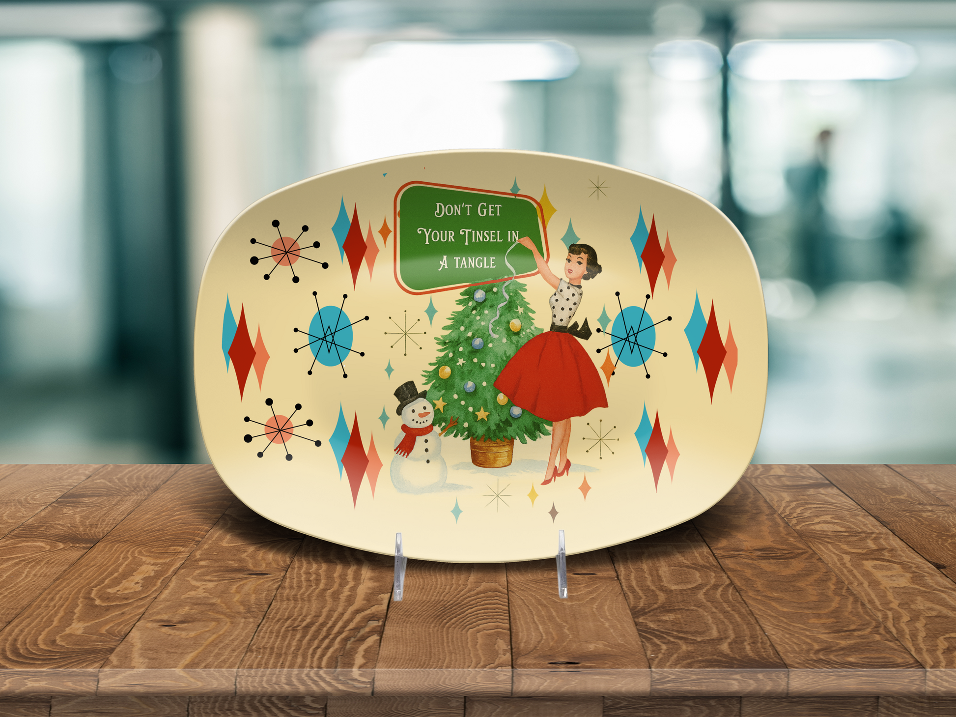 Celebrate the season in style with our Vintage Christmas Oval Serving Platter, a charming addition to your holiday decor. This beautifully designed platter features a classic mid-century modern design with vibrant retro patterns and holiday motifs, making it a delightful centerpiece for your festive gatherings.