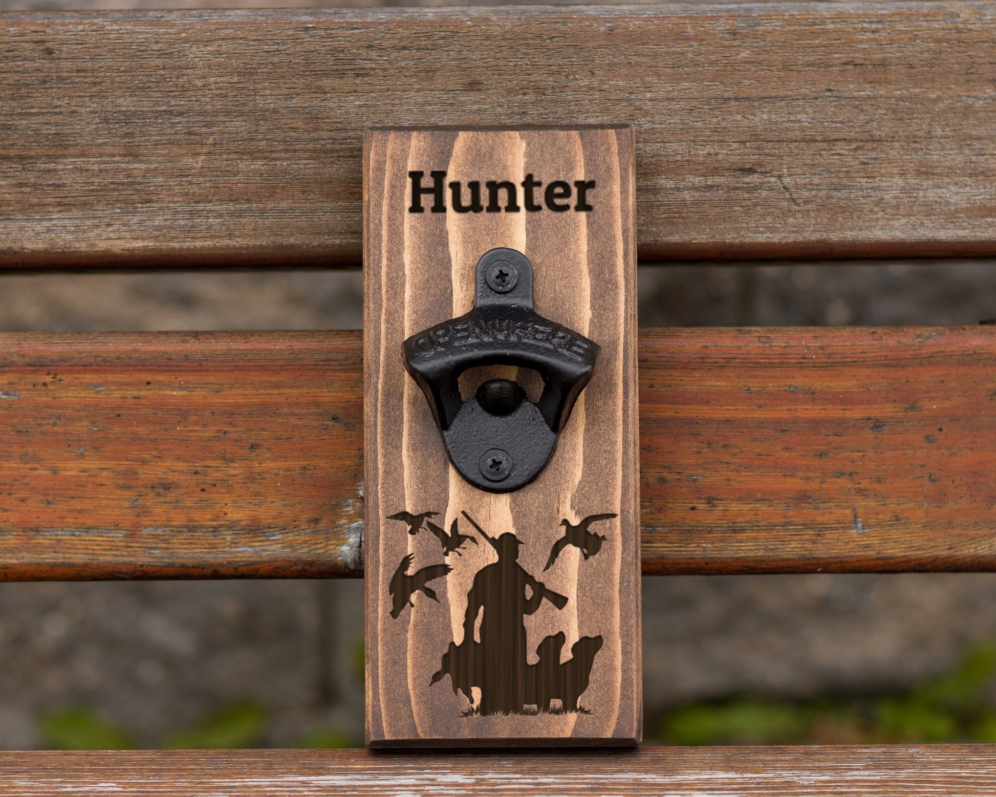 Wall Hanging Bottle Opener/Personalized Duck Hunter With 2 Dogs/ Laser Engraved With Hunters Name/ Duck Hunting Gifts For Men